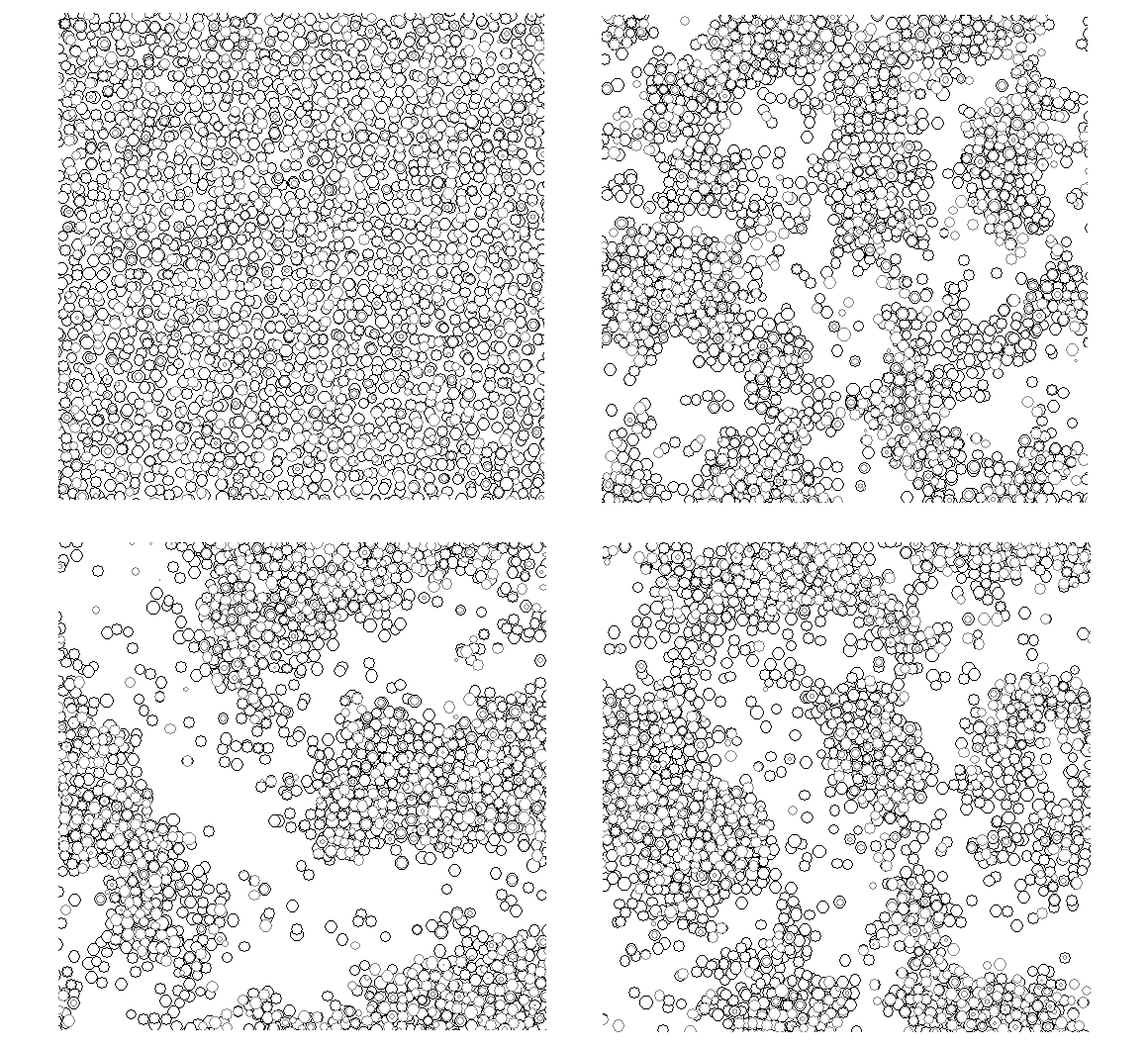 I recently had reason to do one of the most fun parts of any PhD, which is to make pictures. This one is of phase separation into gas and liquid regions, in a fluid made of solid particles surrounded by short range attractions. Just by moving around at random (Brownian motion) the particles collectively ‘realise’ that they can lower their free energy by splitting off into two distinct phases, so they do.