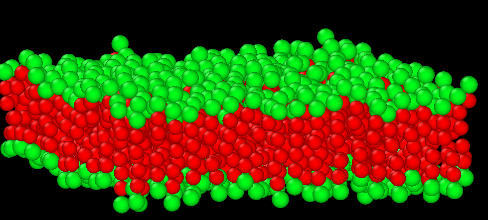 Here’s a snapshot from some early computer simulation work I’ve been doing. It’s a homemade version of a wide class of models where simplified lipids are represented as chains of 3 beads, one hydrophilic (green) one and two hydrophobic (red) ones.